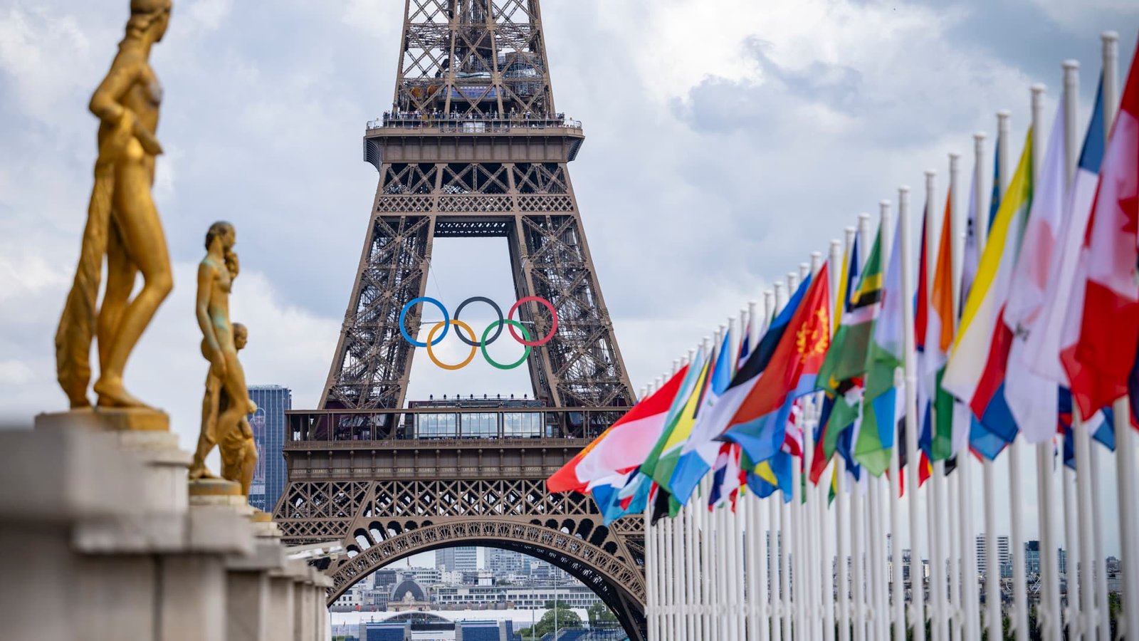 A panoramic view of the Eiffel Tower, decorated with the Olympic rings and the flags of the participating countries, from Trocadero Square ahead of the 2024 Paris Olympics in Paris, France, on July 21, 2024.
