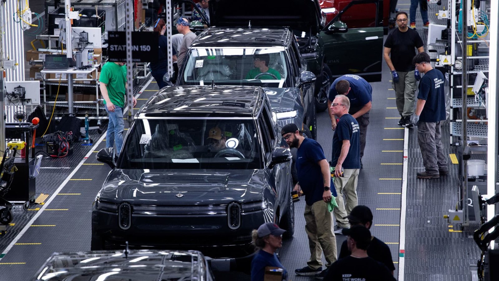 Workers assemble the second-generation R1 vehicle at electric vehicle maker Rivian’s manufacturing plant in Normal, Illinois, USA, on June 21, 2024.